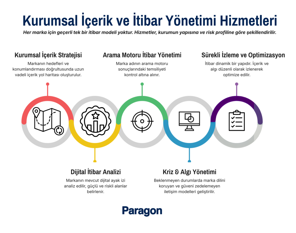 Kurumsal itibarın rastlantılara emanet edilmediği, içerik ve stratejinin birlikte ele alındığı bir yapı kurmak mümkündür. Paragon Teknoloji, dijital algıyı günlük reflekslerle yöneten kurumlar için sürdürülebilir bir itibar mimarisi oluşturur. İtibarınızı günlük olarak inşa etmek ve süreci şansa bırakmamak için size özel stratejiler geliştirilmesi gerekir.
