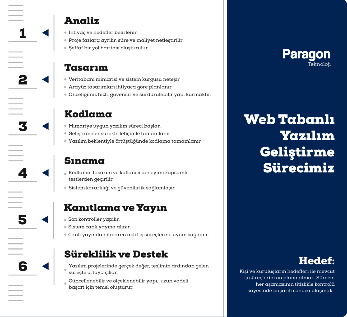 Paragon Teknoloji olarak, kurumların dijital ihtiyaçlarını ele alırken bugünden başlıyor, gelecekteki büyüme ve değişim senaryolarına uyarlayacak şekilde geliştiriyoruz. Çalıştığımız kuruluşlar için hazırladığımız web tabanlı yazılımları o kuruluşun dinamiklerine özel olarak geliştiriyoruz. Kurumunuz için hazırladığımız web tabanlı yazılımları operasyonları sadeleştiren, veriyi merkezi hale getiren ve karar alma süreçlerini güçlendiren bir yapı olarak konumlandırıyoruz.