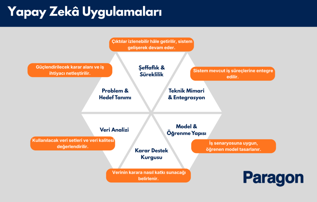 Akıllı uygulama projeleri birçok kuruluş için "yeni bir yazılım geliştirme" çalışmasıdır. Oysa modern yaklaşımda AI projeleri, var olan iş modelini yeniden düşünme ve geliştirme fırsatı sunar. Bu nedenle Paragon Teknoloji, yapay zekâ süreçlerini bütüncül bir yapı olarak ele alır. Her projede öncelikle şu temel başlıklar netleşir: